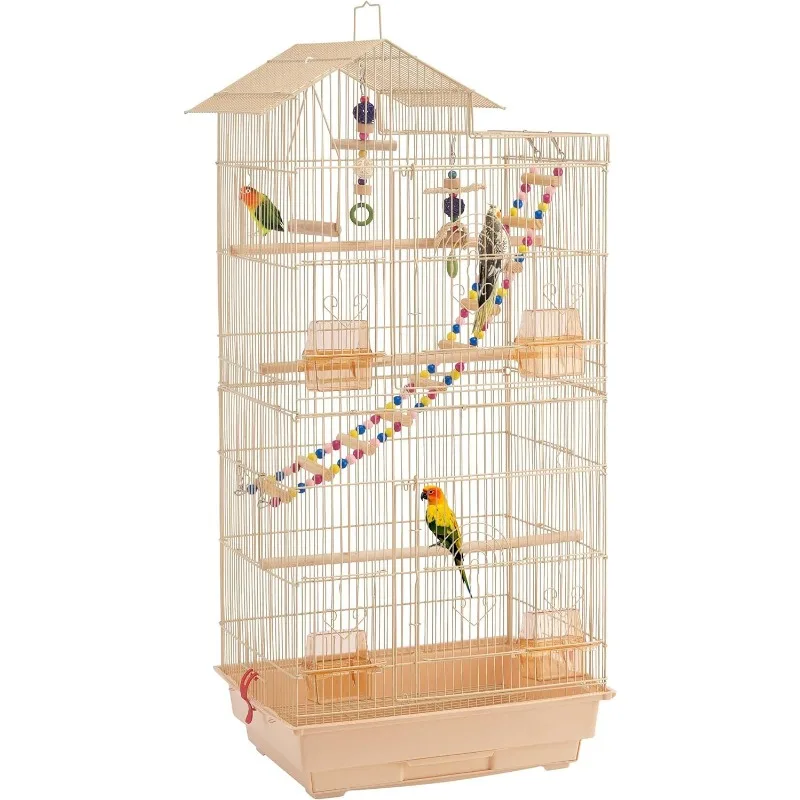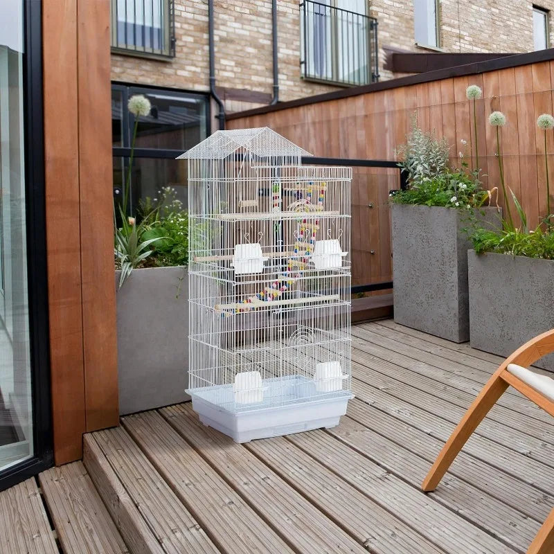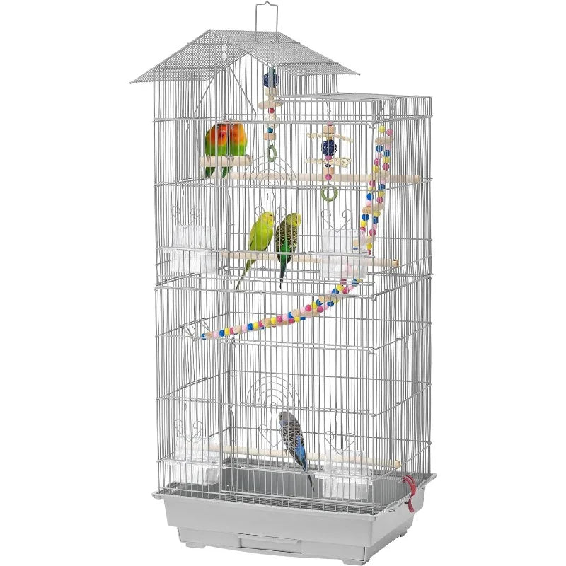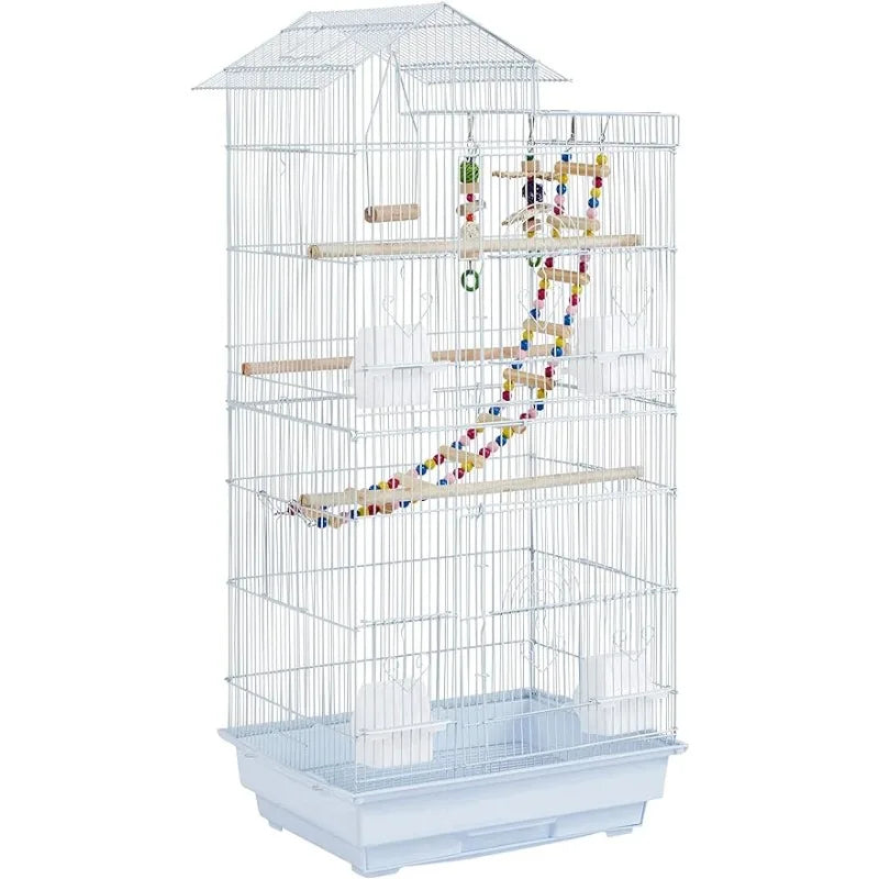 39inch Height Roof Top Bird Cage Medium Metal Parakeet Cage with Swing & Ladder, White