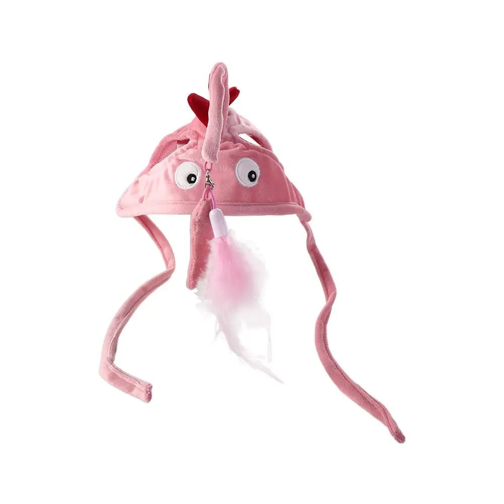 Engage your cat in playful hunting instincts with our Cat Interactive Fishing Headdress Toy. This innovative toy features a fishing head cover with feathers that mimic prey, enticing your cat to play and pounce. Ideal for interactive sessions, it promotes exercise and mental stimulation. Perfect for kittens and adult cats alike, this toy enhances their natural instincts while providing hours of entertainment. Add excitement to your cat's playtime with this fun and engaging accessory.