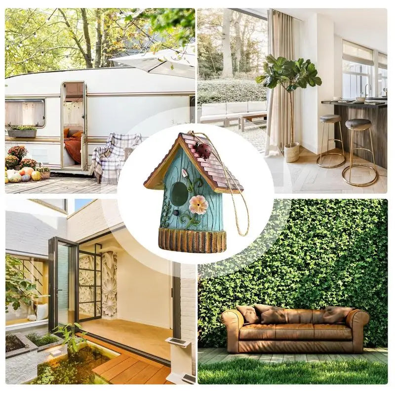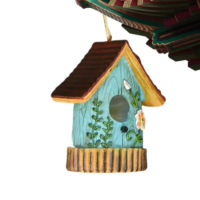 Hangable Bird Houses for Outside, made from resin and hand-carved, provide charming and functional nesting spaces for birds in outdoor settings. These houses are crafted to withstand weather conditions and feature intricate designs that add aesthetic appeal to gardens or yards. With a hangable design, they can be easily suspended from branches or hooks, providing birds with a safe and cozy shelter to rest, nest, or seek refuge. These bird houses not only enhance your outdoor decor but also contribute to supporting local bird populations by offering them a welcoming habitat.